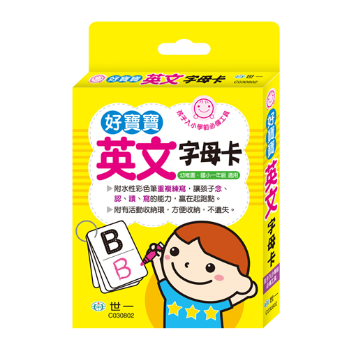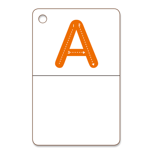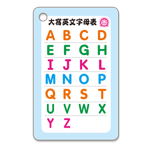 雙面上光裱褙的英文字母卡,可重複擦寫練習使用,所附之塑膠扣環不僅讓紙卡能方便收納,還能隨身攜帶,讓寶貝不管走到哪,皆能隨時隨地練習、認識26個英文字母。
