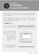 Spotlight 的搜尋速度極快,而且可以搜尋檔案內文。假使你要找一份 2015 年的報表,在過去可 能慣用到「公用資料夾 > 報告資料 > 報表 > 2015 >......」這樣去翻找,但在 Mac 中,只要透過 Spotlight,就算你只隱約記得報表的標題好像叫做「2015 年度報告⋯⋯」,也可以直接搜尋出這 個...