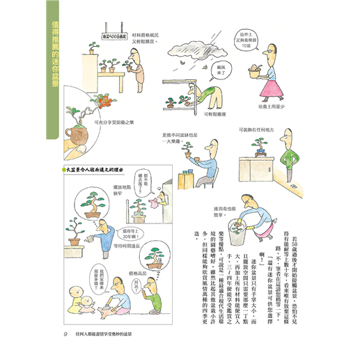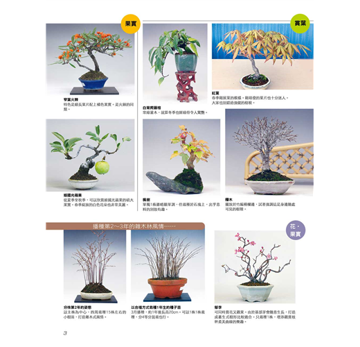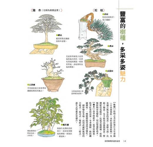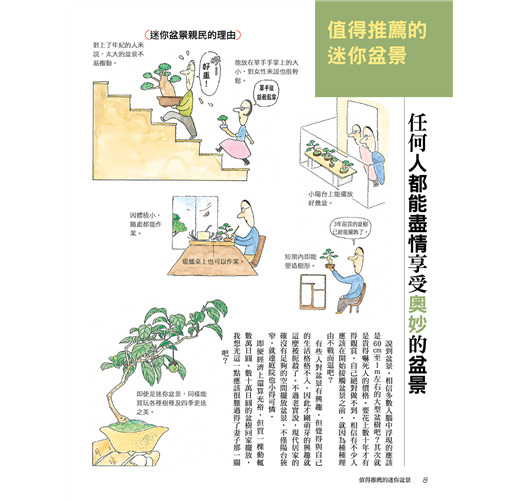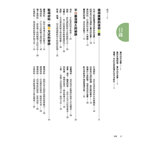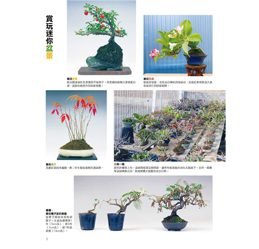 本書為了讓更多盆栽同好了解迷你盆栽的手掌園藝世界,完整收錄了關於迷你盆栽的優點、栽種方法、剪枝‧修根‧換盆等相關知識,要讓每一個喜愛盆栽的朋友,在有限的金錢、空間之下,也能盡情享受盆栽之樂!