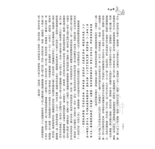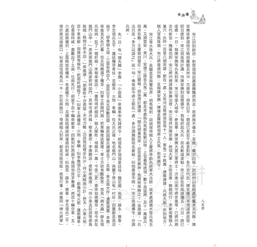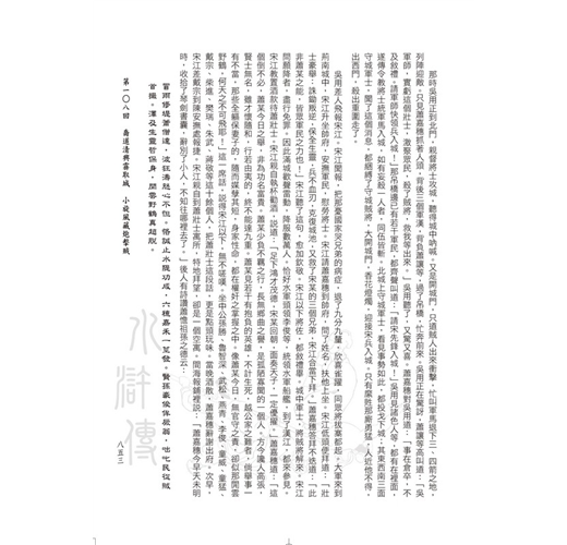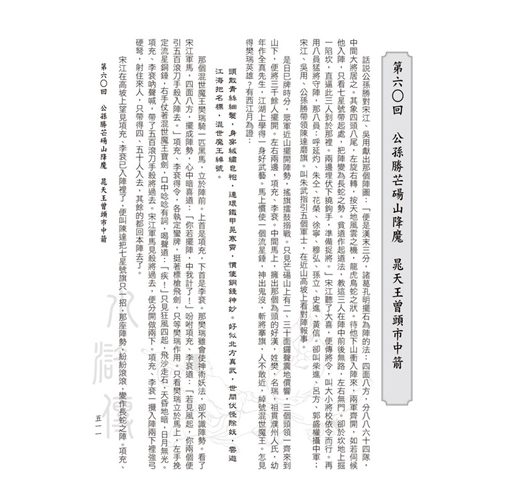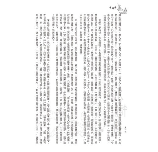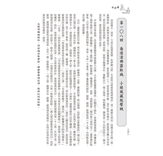 (三) 第八一回至第一二○回:講述梁山泊歸順朝廷之後,東征西討,抵禦外敵,直至最後兔死狗烹的悲壯故事。
