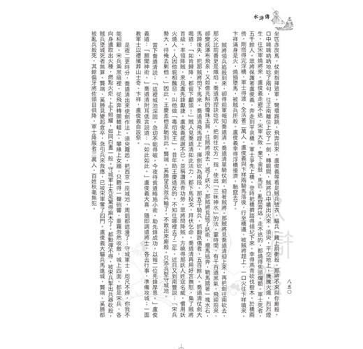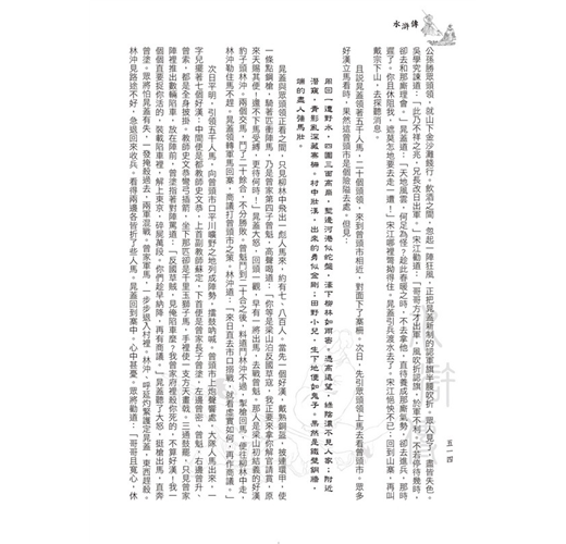 內容塑造了俠行義舉的宋冮、史進、吳用、林沖、李逵、魯智深、武松、盧俊義、楊志等英雄好漢,更表達了北宋年間的社會紊亂及政治腐敗的情況。