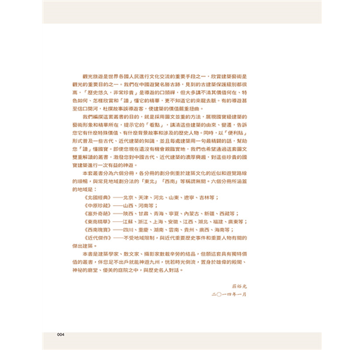 我們編撰這套叢書的目的,就是採用圖文並重的方法,展現國寶級建築的