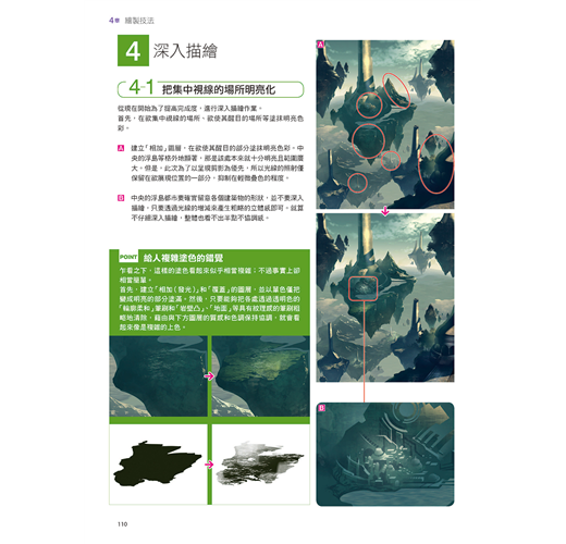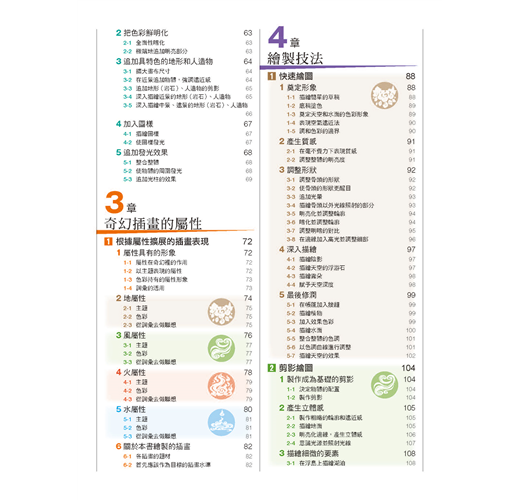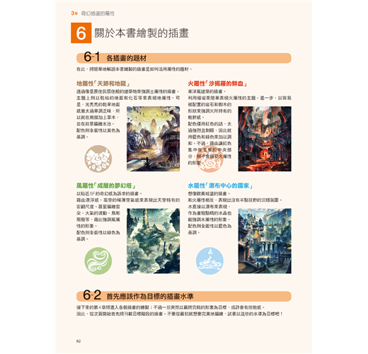後半則刊載風景插畫的繪製。以奇幻插畫中不可欠缺的四大元素(地、水、火、風)為題材,透過分別處理相異的技法毫不藏私地公布作者所擁有的技巧。