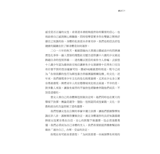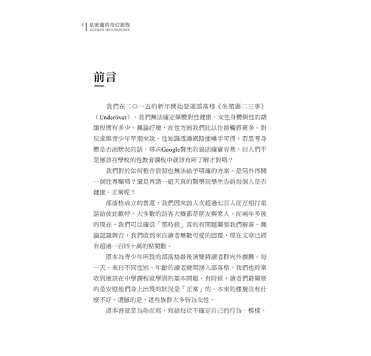 這本書就是為妳們而寫,寫給每位不確定自己的行為、模樣、感受是否正確的女孩們,並告別圍繞著女性解剖學的神話和誤解。