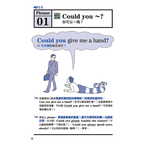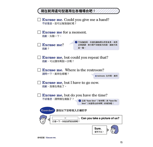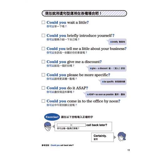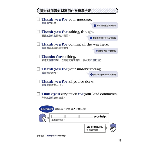 本書不是要訓練你「日常生活會話」!而是要你將「每天會說的話」用在各種交際場合。事實上,不管我們是在學校、外出旅行、到醫院看病,或是在工作場合,或者聊天的對象無論是同事、熟或不熟的朋友或是家人之間,我們所使用的「萬用句」,其實差不多都是那幾句。比方說,「拜託人家做什麼事」,我們都會用 Could you…? 開頭的萬用句:Could you wait a bit?(麻煩你等一下好嗎?)、Could you please be more specific?(可以麻煩你說得具體一點好嗎?)、Could you give me a discount?(可以給我個折扣嗎?)…等等,也就是說,我們每天聊天的話題都會觸及各種場合與情境,因此只要用自己最熟悉的話當作萬用句,靈活搭配不同字詞即可運用在不同場合!也由於這些話都是生活中最熟悉的句子,根本無需勉強硬背或刻意練習,自然運用就能夠流暢地說出,告別菜英文。