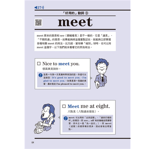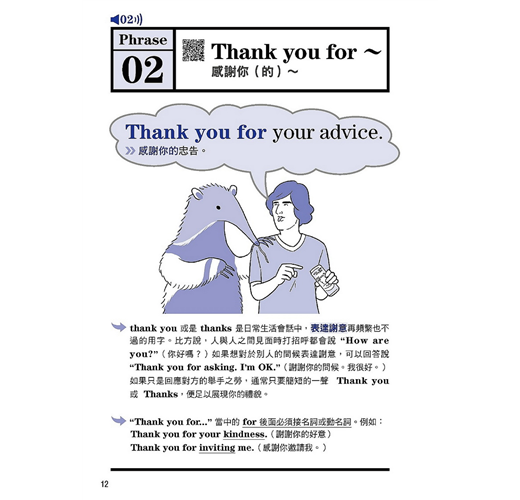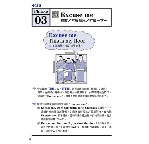 另外,語言的學習,必須「眼 + 耳」同時並進。您可以透過隨書附贈的MP3 光碟,或是用手機掃瞄每一句的QR碼,即可隨著標準的美式發音,隨時隨地逐字逐句跟讀,訓練道地口音。