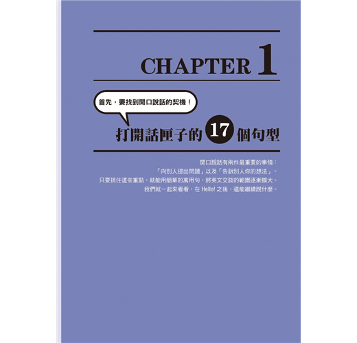 學校教科書的內容以及一般英語會話書籍,都習慣將會話的場景「用框架框住」。比如說「在機場」、「在海關」、「在飯店」、「在超市」、「在會議中」…等,這樣的情境分類方式雖然可以讓學習者感覺「我只要學會這些『必須要學的』的字詞就夠了。」但事實上,往往是因為工作或某種特定需要,「被迫」去學那些字詞及用語!如此勉強自己去記憶這些東西,很容易抹煞了學習英文的興趣。有些書甚至會限定好使用場景,在此場景中提供你一堆英文句子的小抄,要你照著唸就好。但是人不是讀稿機,而現實中遇到的狀況也常常超出書本原本所設想的範圍!用這樣的固化學習,許多人遇到突發狀況就會腦筋瞬間空白,原本努力背下的東西全部忘得一乾二淨。本書所收錄的萬用句,並未框定特定領域,大部分的句子都來自你平常「想要表達自己的想法」以及「想要與別人分享的經驗」,使用的範圍及自由度都非常高,經過套用都能在不失誤的範圍裡進行對話。更確切說,想要自由自在的用英文交談,是建立在「想要怎麼說」的概念上,而不是建立在「必須怎麼說」的概念上!如此脫離讀稿機般的學習,才不會像大多的英語會話學習書籍,莫名地陷入一個「你必須這樣學」、「你必須這麼說」的窘境。