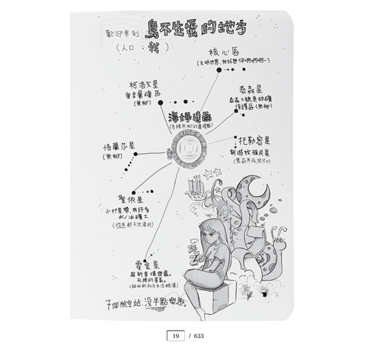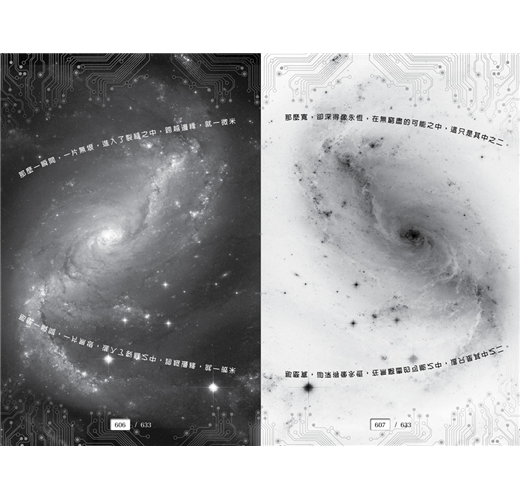 星星。無數的星星。星群、星系和生命之樹\宇宙樹\尤克特拉希爾星雲都慢慢隨著海姆達爾站的中心蟲洞旋轉、飄過窗外,次音速嗡嗡聲幾乎聽不見,無窮盡的世界就在你的頭上等著。我第一次到這裡的時候,還有點擔心睡在宇宙時空這塊布面上的破洞會是什麼狀況,現在我只擔心沒了這裡,我還睡不睡得著。