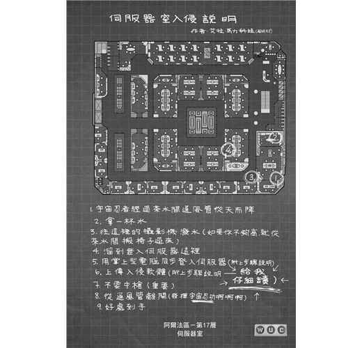 一陣輕聲耳語,眾人眼光四處掃射。我到處都沒看到葛蘭特工程長,但是唐納利指揮官還穿著正式裝束站在舞台上。令人敬佩的是,整個入侵過程他都沒失控,還把人潮趕到講台後方躲避,要大家保持冷靜。他就是名軍官,已經很習慣當機立斷做出指揮決策了。他知道自己武力和人力都不如對手,從對方的專業模樣就能清楚明白──這些人來此顯然是有原因的,他決定靠策略和手腕迎戰。