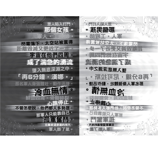 驚慌的局面終於漸漸平定。比較清醒的那些人開始說服朋友冷靜下來,阻止了尖叫聲、哭喊聲和耳語。大概花了五分鐘吧,整個過程之中,伏克一根神經都沒動,彷彿他在把整個局面的混亂能量吸進自己體內,像要完全吸乾那樣。直到中庭層整個安靜下來,靜到我發誓連一根■■的針掉在地上都聽得到為止。