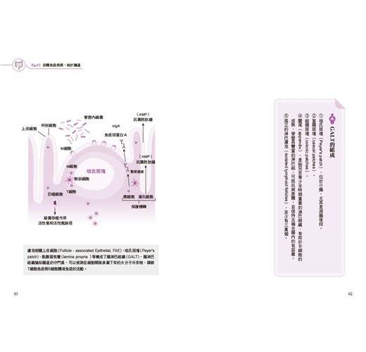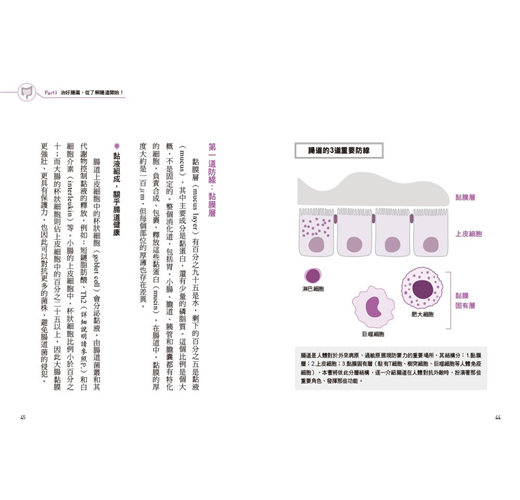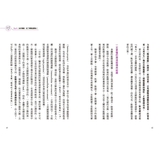 【PART 1】治好腸漏,從了解腸道開始! ◎人體最大器官──腸道 消化道總長達九公尺 小腸,表面積為皮膚的百倍 水進入消化道後多被小腸吸收 消化十五頭大象的繁重工作量 消化道的各部分工 消化道每個部位的酸鹼度不同 短鏈脂肪酸的妙用 短鏈脂肪酸的兩項重要機轉 ◎腸道,人體抵抗力的重要防線 黏膜,身體的重要介質 一同探索腸道結構與組織 抵抗力的第一道防線:黏膜層 抵抗力的第二道防線:腸道上皮細胞 抵抗力的第三道防線:黏膜固有層 【PART 2】自體免疫疾病,始於腸道 ◎腸道在免疫系統扮演重要角色 最重要的免疫器官──腸道 免疫細胞的保全系統 免疫大軍的前線戰士:非專一性的免疫細胞 免疫大軍的後方戰士:專一性免疫細胞 ◎免疫作用的重要3道防線 第一道防線:先天性免疫 第二道防線:吞噬性白血球和發炎反應 第三道防線:後天免疫力 ◎黏膜免疫系統中的重要戰役 立即偵測、殲滅,產生免疫反應 SIgA,黏膜系統的重要衛兵 【PART 3】 百病源頭──腸漏症 ◎隱形數百年的流行病 ◎診斷新里程──解連蛋白的發現 認識腸漏症 快速發展中的解連蛋白研究 ◎腸漏,造成人體極大傷害 慢性病源於與腸漏? 難解疾病背後的主因在腸漏 自閉症與腸漏有關? ◎你「腸漏」了嗎?檢測腸漏症的5種方法 確診,仍有困難! 檢測法1.小腸滲透力分析:準確度高且普及 檢測法2.解連蛋白檢測:簡單但準確度低 檢測法3.小腸內視鏡:具侵入性 檢測法4.閉合蛋白檢測:有助早期診斷 檢測法5.鈣衛蛋白檢測:症狀嚴重患者適用 ◎與中醫理論相呼應的「5R計畫」 【PART 4】創造與人體互利共生的腸道菌 ◎人體99%的細菌質量在腸道 精確研究腸道菌種不容易 腸道菌種,劃時代的新發現 細菌決定了命運? 腸道菌叢多樣性低較不佳 ◎腸道菌是「器官」,不是「害蟲」 長期被汙名化的細菌 腸道菌分成3種角色 腸道菌分屬6大門 孩子的腸道菌最先來自母親 ◎腸道菌決定一生健康 腸道菌的3大特殊功能 腸道菌與上皮細胞對話的3途徑 中性菌可刺激免疫力 腸道菌失衡,健康問題多多! 難分好壞!菌叢生態平衡才重要 ◎台灣人的腸道已不堪虐待 台灣大腸癌發生率世界第一 預防腸道致癌之道 萬物之靈的人類請拿回主導權 【PART 5】腸漏,造就現代社會流行病! ◎難以確診的疾病──自體免疫疾病(Gut-Joint) 自體免疫疾病患者愈來愈多 自體免疫系統為何與你為敵? 自體免疫疾的致病機轉 這是一種難以確診的疾病 典型的發炎反應 自體免疫疾病的檢測有哪些? 醫界的治療新方向 預防自體免疫疾病的方法 Dr.Ho的調養建議 ◎極其普遍的慢性病──代謝症候群(Gut-liver axis) 什麼是代謝症候群? 脂肪肝千萬不能放著不管 非酒精性脂肪肝炎的致病機制 肝與腸,大有關係! 腸漏症,非酒精性肝炎的推手 脂肪肝的診斷 脂肪肝是可逆的病變 ◎高壓時代下的現代病──神經系統疾病(gut-brain axis) 壓力對神經與內分泌的影響 壓力VS神經系統 腸神經系統是「第二大腦」 益生菌好夯,治療有效嗎? 過度壓力對消化道的危害 高壓時代下容易引起的疾病 長期壓力使腸漏症更嚴重 腸胃鬧脾氣,壓力是元凶 【PART 6】 5R重建你的腸道屏障 腸道重建計畫最重要的一步──1R排除(Remove) 避開扣下罹病板機的食品添加物 避開過敏原的日常飲食法 戒麩質很難?回到阿嬤時代的飲食就好 藥物毒素會破壞腸道菌叢 如何選對適合自己的益生菌產品 未來益生菌配 補充酵素和調整消化道酸鹼度──2R替代(Replace) 研究論文佐證的菌株──3R再接種益生菌(Re-inoculate) 種稻施肥、欣欣向榮──4R再生修復(Regenerate&Repair) 修復腸道的良藥──5R留住品味生活(Relax&Retain)