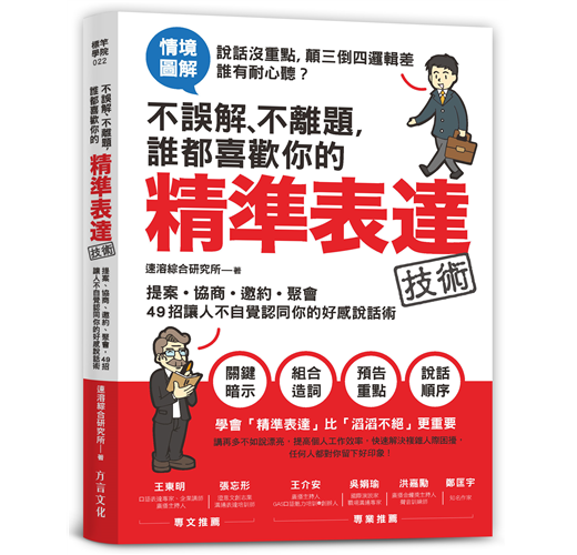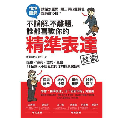 無論是與上司討論、同事相處、客戶往來、業務談判、聚會聯誼等人際交流,表達技術的好壞,對於結果有著相當大的影響。具備精準表達力,能讓人對你留下好印象,幫助改善工作效率,快速解決複雜人際困擾。