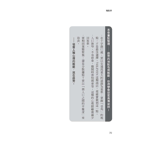 每天通勤或營業時,總是無意間在街上走著,你讀過這本書之後,要不要試著讓逛街的每一瞬間都更有趣,進一步找出商業上的啟示?我想,對於經常外出或喜歡逛街的人來說,很快就會感受到:「街上到處充滿了地點的布局戰略。」