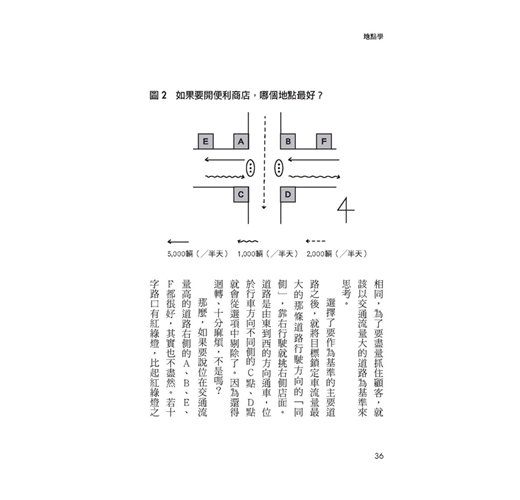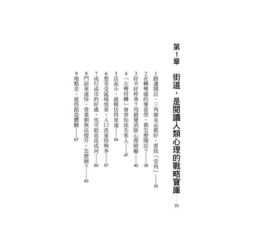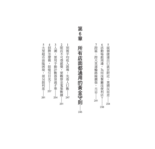 本書為了讓各位了解所謂的地點布局戰略為何,我將以身邊容易理解的範例,帶領你觀察路邊的店鋪(第一章),而後一覽大家每天都會利用的便利商店業界(第二章)、餐飲店(第三章)的攻防策略,再進一步學習不僅限於這些行業、業態的其他類型(第四章)。接下來跳脫業界的框架,從街道或車站的視角,來學習挑選適合的地點(第五章),最後則是彙整想實際開店的讀者都應該知道的現實規則(第六章)。