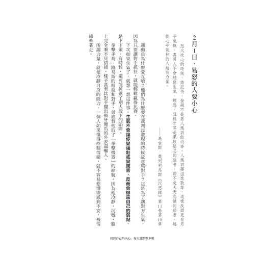 當然,閱讀這本書也不需從頭開始,可以直接從你拿到它的那一日做為起點,依據當日的要領實踐,日復一日,理論與實踐同時並進,雕塑內心,將自己轉換成一個更能適應現代社會,並且可以製造各種幸福的實踐哲人,悠遊世間,享受自在人生。