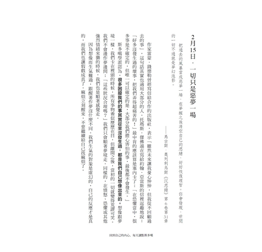 所以,閱讀的時間最好在早上,就把這一天當作是這篇短文的實踐日,一天一篇,用心修練。偶爾忙碌忘了,沒關係,不需給自己壓力,也不用有罪惡感,想起來再繼續。每多做一點,就向前多邁進一步。如果因故漏讀某一日,或甚至好幾日,也沒關係,不用回頭,直接跳過無妨。一年之後,重新開始。沒有使用期限。