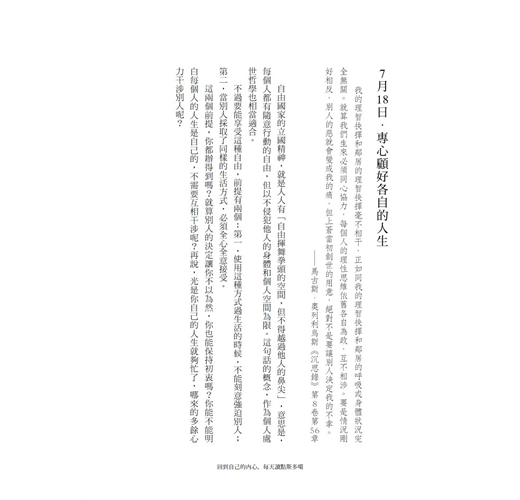 如果你想知道什麼是人生哲學,如果你想提升生命的價值,如果你想獲得幸福的話,請閱讀本書。這是一本有關斯多噶哲學的書,也是編輯很特別的書。本書是按照一年中的每月每天所編排的內容,其中還包含了二月二十九號,所以總共是三百六十六篇。這個編排方式,就是要我們每天讀一點斯多噶哲學。