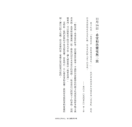 舉例來說,在一月一日的短文中,了解斯多噶主義的重點之一就是當遇到煩惱時,養成習慣去區分這些煩惱是不是可以改變的。即使暫且先不管能否找到改變的方法,也暫且不管能否放下那些無法改變的煩惱,養成區別的習慣,就已經踏上斯多噶主義的道路了。