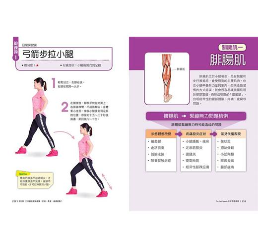 其次是強化與走路最有關的肌肉群,以補強現代人久坐、久站的腰腹臀腿無力現象,黃如玉醫師特別親自設計與示範腰方肌、臀大肌、腓腸肌等十組共三十式關鍵肌群速感鍛練操。在書中除了仔細介紹這些關鍵肌群在行走時所扮演的重要機能,更貼心提供當該肌群緊繃無力時,造成的步態與體態改變,因而引發的疼痛發炎症狀,以及你不知道的身體代償表現等重要醫學知識,只要循著這些健康提醒,就能找出自己最需要鍛鍊的肌肉群。以腰方肌緊繃無力來說,步態體態改變包括:骨盆前傾、翹著屁股走路、小腹凸出等→疼痛發炎症狀:椎間盤突出、腰椎退化、臀部疼痛等→常見代償表現:西洋梨型身材、上背痛、肩頸痠痛等。所以,只要把這些動作成為日常保養操,擊退痠痛、正脊又美肌。