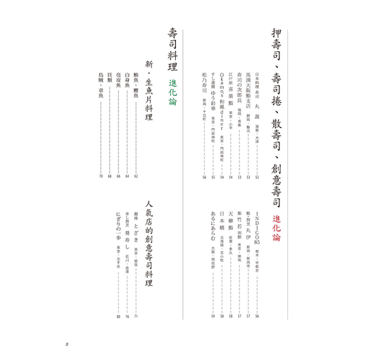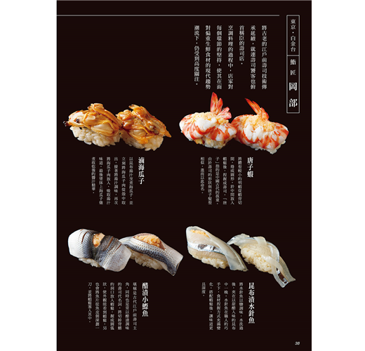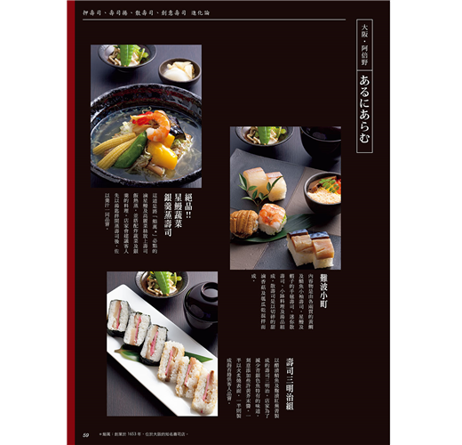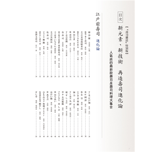 本書集結多家人氣店鋪的最新款壽司以及壽司料理,看職人們如何因應時勢潮流的脈動,針對現代饕客的口味,在這門傳統技藝上持續鑽研精進,昇華壽司料理的品味及價值。
