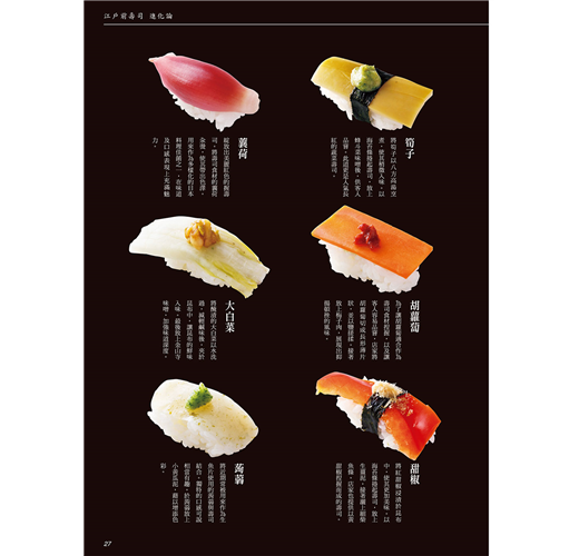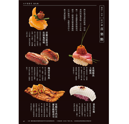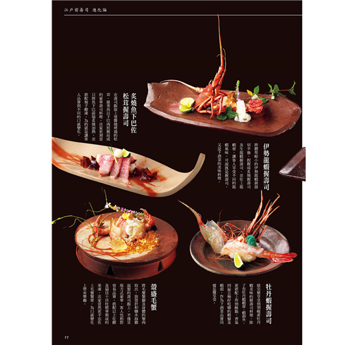 除了江戶前壽司之外,不管押壽司、散壽司、或是壽司捲,都以不同以往的烹調技術及調味方式,搭配既有的壽司食材,甚至融入嶄新素材、選用口感迥異的淋醬或沾醬,打造出不同於過往印象的新風貌。精準掌握現代人的喜好及需求,經過進化洗禮的壽司可是博得滿堂彩。