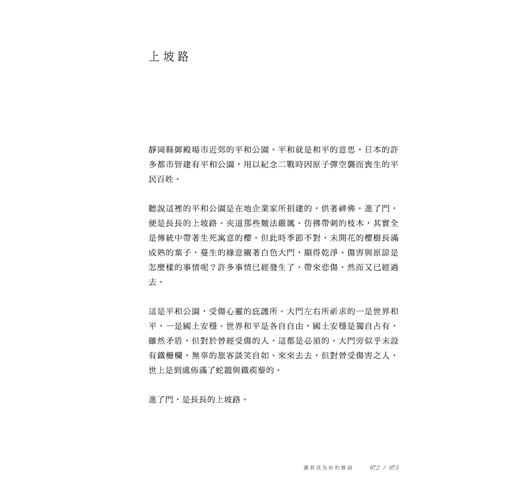 上坡路/燈光亮起的時候/夢與比喻/等待的心/就去愛/在潭水和羽毛之間/玻璃鐘罩裡的回憶/頑固的幽靈/信念無物/幼弱頑強之心/真實的表情/一種勇敢/金色的夏天/木...