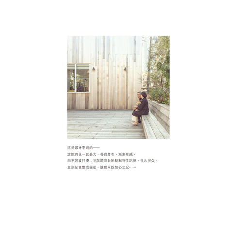 兩人才能環抱的樹身已經裂開了,其所環繞的空間,不多不少也恰好能容兩人藏身。我躲入樹的心中,突然明白了女孩那時所說的話──「你聽得懂嗎?『讓我成為妳的樹』,這是為我好。」她頓了頓,又說:「『讓我成為妳的樹洞』,這是,對我好。」