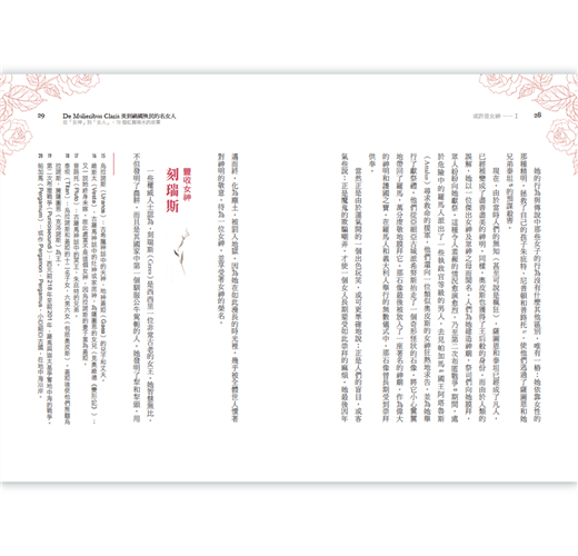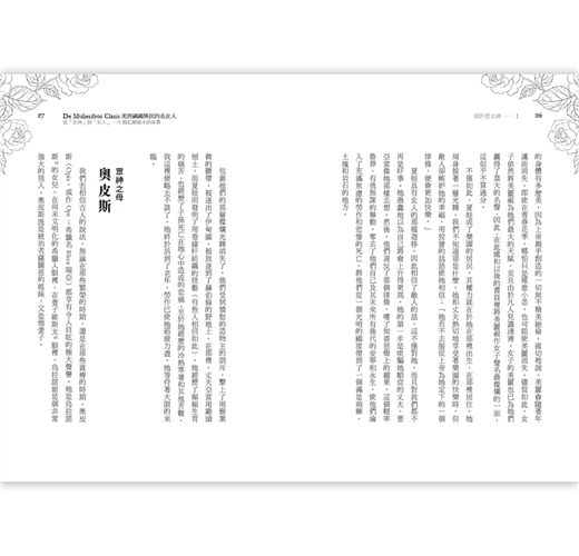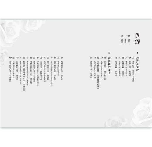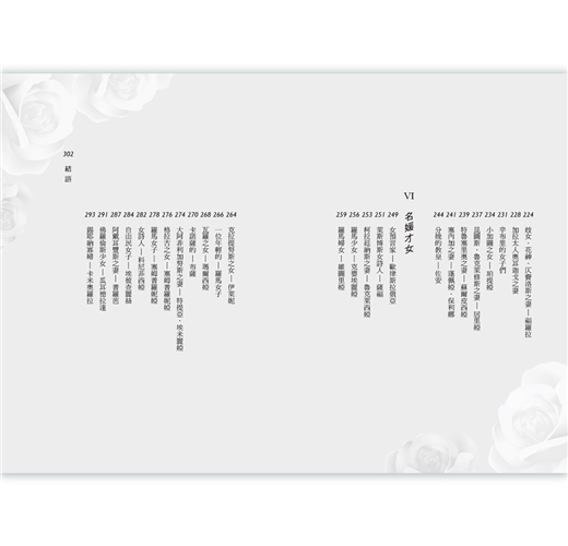 (2) 三十四個古希臘羅馬神話中的女子(第八章到第三十二章),她們或是傳說人物,或為半人半神,並以《聖經》人物尼考拉(即示巴女王)結尾(第三十一章);