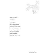 《最後的咖啡》是第一本塞爾維亞詩人艾薇拉.辜柔維琪在台灣出版的著作,她的詩關懷世界人類的存在狀態,尤其是弱勢民族的悲慘困境,語句赤裸,沒有罪惡,也沒有悲傷,足見她的詩具有歷史意義和普世價值。全書收錄35首詩,中英文可前後參照,譯者李魁賢以他擅長的精煉文字重新詮釋,帶領讀者走入塞爾維亞的詩篇。