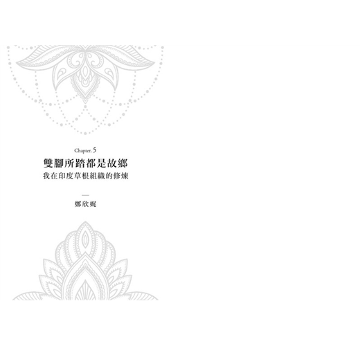 鄭欣娓懷著成為社運人士的夢想,展開她「在印度草根組織的修煉」。她與諸多從台灣前往印度的年輕人一樣,初期的身分是志工,但真正的修煉是不當志工後重返印度,立志成為社運成員的艱辛過程。為了達成目標,她以辦公室為家,攬下所有接地氣的工作,身兼報告寫手、攝影師、秘書、臨時保姆,以及各種辦公室勞務的幫手。多虧草根組織的草莽個性,強迫聯合國接受她是組織不可缺的一分子,我們才有機會看到發展中國家的非政府組織如何執行發展計畫,也分享了她做為外國人參與公民運動的大哉問。