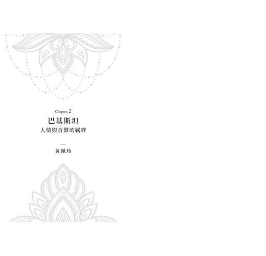 以「人情與音聲的羈絆」寫下巴基斯坦經驗的黃佩玲,初識南亞是透過西塔琴與塔不拉鼓的音聲,然後就像「被聖人邀請般」,一頭栽進神祕的蘇非音樂殿堂,傳唱起蘇非詩歌,也決定開啟她的民族音樂學研究,探索當地的生活慣習、社會語言及音樂活動。做為一名女性外國研究者,她幸運地突破性別界限,遊走於不同場合與階級之間,帶著讀者一窺外人難以觸及的面向。在巴基斯坦闖蕩多年,她也點出民生問題和貧富差距帶來的矛盾情感:這裡的人們一方面展現出真摯情感,卻也因為身處不平等結構而表現出令人遺憾的自私。