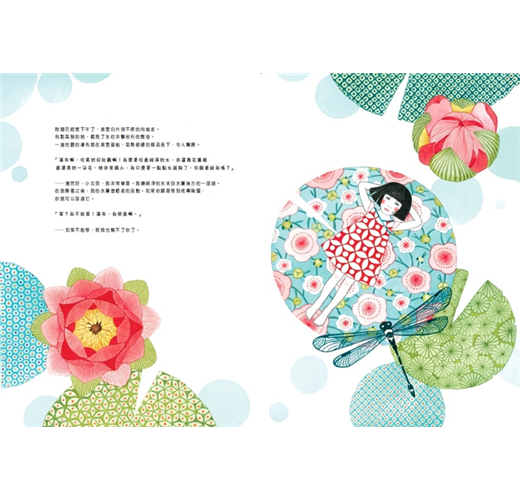 細心的讀者應該還會發現,書名頁等頁面,暗示了小女孩美雪的造型來自木芥子(春日)以及和紙娃娃(夏夜)。木芥子是一種手作的木偶娃娃,有著簡單的肢體及刻意放大的頭部,配上幾條用來表示臉部的線。和紙娃娃是以千代紙摺製而成,江戶時期開始流行於民間。兩者都是女孩子們的擺飾與玩具,都很「日本」。這樣的「選角」,與千代紙般裝飾風格的畫風,配合得天衣無縫。然而,畫面的構圖卻很西方、具現代感。童話的故事情節、傳統日本的美學加上西方的構圖設計,如此多層次的混搭,讓這兩本繪本的圖文共奏,值得再三吟味。