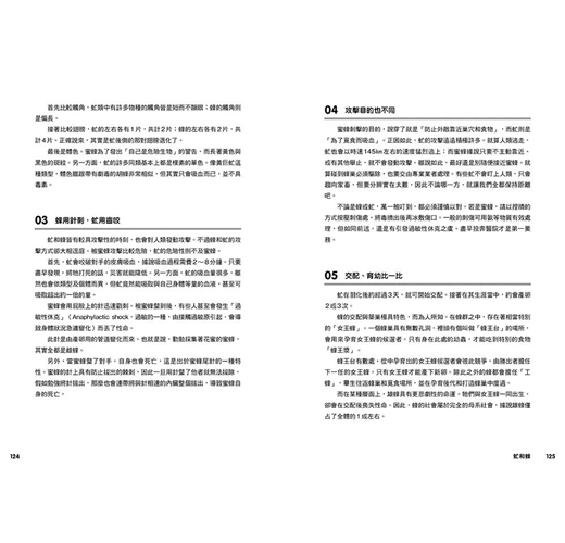 蜜蜂會用屁股上的針迅速戳刺。被蜜蜂螫到後,有些人甚至會發生「過敏性休克」而丟了性命。此針是由產卵用的管道變化而來。也就是說,勤勉採集著花蜜的蜜蜂,其實全都是雄蜂。