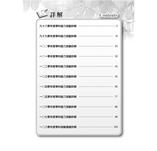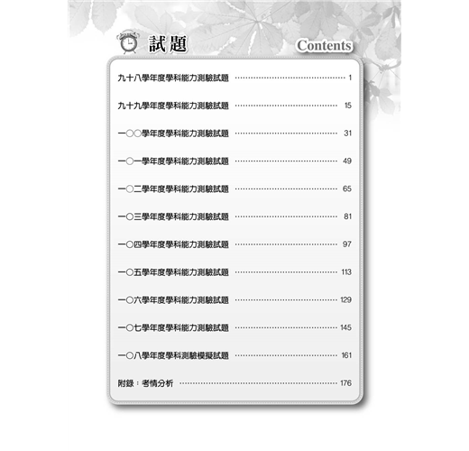 完整收錄大學入學考試中心公布,九十八年至一○七年的學科能力測驗試題;此外,更集合國內升大學補教名師、在校名師,詳加研究考情趨勢,依照最新的考題格式,編修一○八年的最新模擬試題供學生自我檢測。