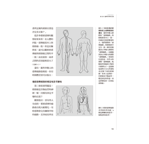 一、循經感傳現象路線的穩定性及可變性:「循經感傳」又稱為「氣至病所」或「得氣」。經由研究發現,感傳路線有時會出現大幅變化,甚至會完全離開平時的路線直奔病所。所以張教授認為「經絡完全不像許多人想像的那樣,是一個固定的管道。至於針灸教科書中所畫的經絡圖,所描寫的明確位置,只是為了方便初學者使用,是一種大大簡化了的說明圖。其實有經驗的針灸師都知道,實際情況並不是這樣簡單。」(見87頁)。此項觀點,與我們臨床應用經絡診斷治療的經驗不謀而合。
