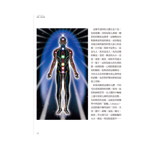每個人身上都帶著跟天使一樣的光環,而且身體裡還有一圈又一圈五顏六色的線條,像美麗的煙火、彩色的噴泉、五彩的火山光芒和太陽的日冕。人體還是個諧振腔,隨著身體、心理狀態演奏出不同的樂曲,這些都是看不見、摸不著的經絡系統最具體的呈現。運用現代尖端科學儀器,已能輕易發現古人言之鑿鑿的經絡如何具體存在於人體,並如何進行能量運作和能量共振,傳送身心的訊息。
