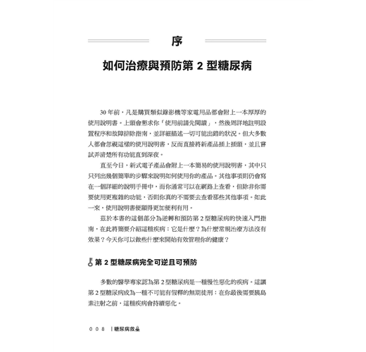 扭轉第2型糖尿病的秘密就在我們的掌握之中。你需要的只是保有一個開放的心態去接受一個新的方式,並勇於挑戰傳統的智慧。當你有基本的了解之後便能準備開始進行。不過如果要真正理解為什麼第2型糖尿病是一種流行疾病,以及如何有效管理自己的健康,請繼續閱讀下去。祝你好運。