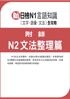 N1的文法考題中,也會出現N2範圍的題目,故本書最後特別將N2文法精華整理成附錄,幫助讀者在最短時間內,快速瀏覽,備考才能做到真正的萬無一失!