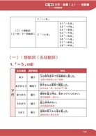 第一單元共有七個小章節,分別為「訓讀名詞」、「和語動詞」、「イ形容詞」、「ナ形容詞」、「副詞」、「外來語」、「接續詞」。並以表格統整,幫助記憶。