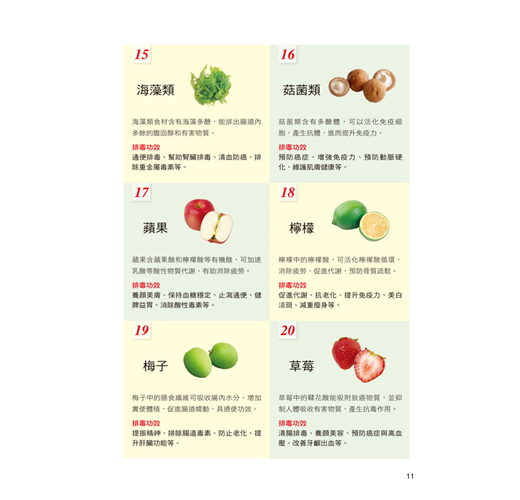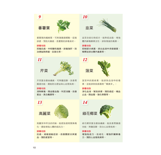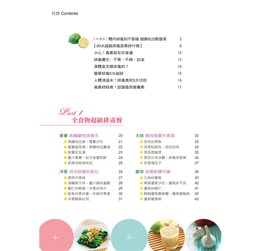 生活中養成良好的習慣,例如不熬夜、少吃油炸燒烤食物等,也能避免體內毒素形成;多喝水、常運動也能幫助毒素的代謝。但影響人體健康最關鍵的仍是每日3餐的飲食,我們常會說「病從口入」,即便無法避免外來毒素的危害,健康同時也能透過飲食來調養,掌握20大排毒蔬果,協助您代謝毒素,吃出健康輕瘦美!