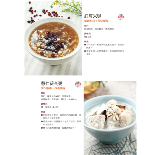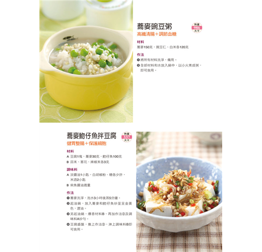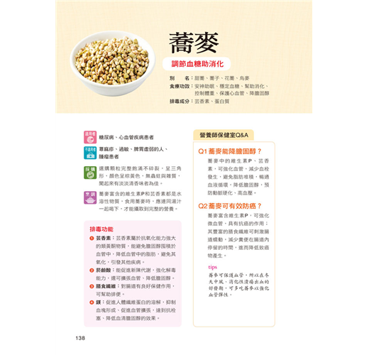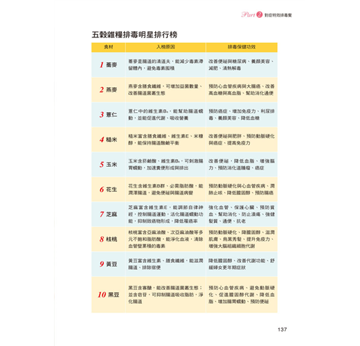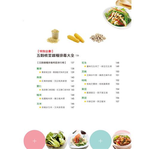除蔬果外,五穀雜糧富含膳食纖維及不飽和脂肪酸,排毒效果也不容小覷,前者能改善腸道菌叢生態,促進排便;後者能降低體內壞膽固醇,達到淨化血液、預防動脈硬化等功效,是對三高患者有益的食材,本書對此部分亦有詳盡介紹,可提供讀者作為參考。