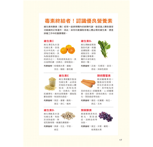 維生素和酵素(酶)經常一起參與體內的新陳代謝,能促進人體各器官功能維持正常運作。因此,如何均衡攝取各種人體必需的維生素,便是排毒工作中的重要環節。