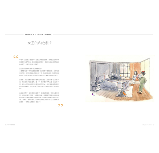 張馨親筆手繪的故事主角:小國王,其實就是張馨人生中最重要的另一半──蕭大。張馨從夫妻的日常點滴、拌嘴過程,延伸出溫暖有趣的手繪故事,令人會心一笑。