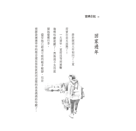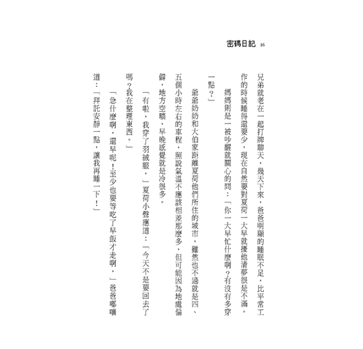 她都已經想好了,一回去就要立刻去找小俞。小俞名叫俞夢嬌,打從上國中,在新生訓練期間相識以來,兩個女孩就一見如故,非常投緣。小俞現在是夏荷最好的朋友,好到什麼程度呢?用一件事就可以說明:這兩個女孩從半個多月前開始,悄悄約好了一起寫非常私密的「交換日記」。