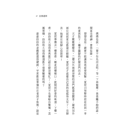 秀麗就是夏荷的媽媽,是一家單位的中階主管,在大伯母看來,這個弟妹是一位了不得的職業女性,想像中肯定有忙不完的事。奶奶聽了大伯母的話,不吭聲了。夏荷知道大伯母剛才是好意想要幫忙解釋,但是她又擔心奶奶會怪罪媽媽,趕快主動說:「沒有啦,爸爸跟我也有好多事的,爸爸最近在趕一份報告,我也有好多作業要寫。奶奶我跟你說,老師根本都不讓我們過年的,老是怕我們玩瘋了,所以就故意出了滿坑滿谷的作業,寫都寫不完。」