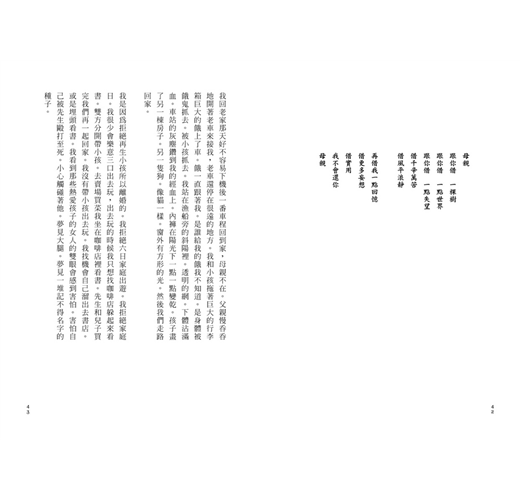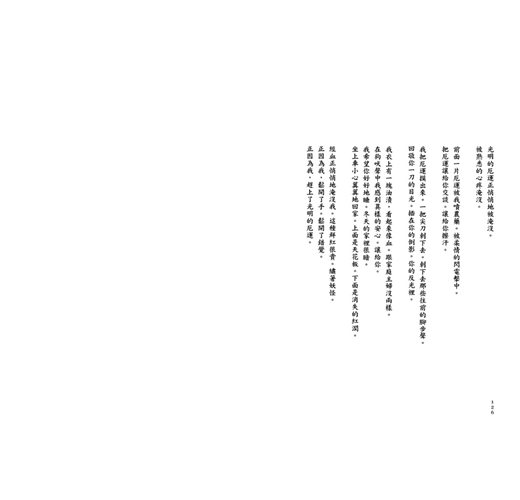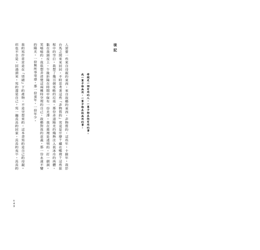 那個時候,我在陽台晒小孩的衣服。熱帶的午後斜陽刺眼。我從陽台望下家裡的庭院,那裡的一棵一棵樹。我感到怒意。怒從一棵樹跳到另一棵樹。那個時候,我開始想寫一本對父母親的仇恨之書。那個時候,我小孩又在復發氣喘。我又開始六神無主。我又開始在文字裡感到殺人的動機。
