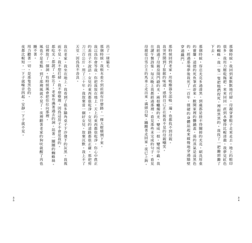 我經過了母親房間門縫的光。兩根蠟燭的光。變成一根。變成半截。我在讀午餐詩集。每天晚上我都經過那裡。看見那些未完成的句子。看見母親從白雪公主的馬車上走出來。滿頭白髮。蹣跚著走回家。夜已上鉤。吊了一球貓毛。
