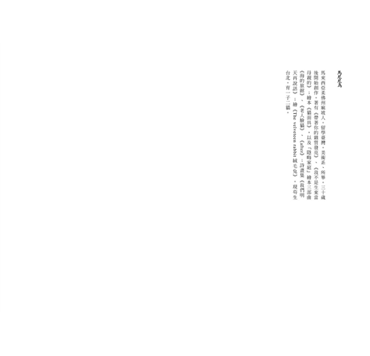 馬來西亞柔佛州麻坡人。留學台灣。美術系、所畢。三十歲後開始創作。著有《帶著你的雜質發亮》、《我不是生來當母親的》;繪本《貓面具》,以及「隱晦家庭」繪本三部曲《海的旅館》、《老人臉貓》、《after》;詩畫集《我們明天再說話》;繪《The velveteen rabbit絨毛兔》。現苟生台北。育一子二貓。