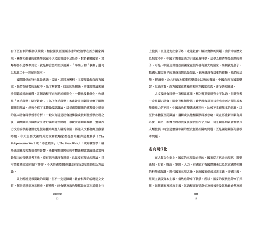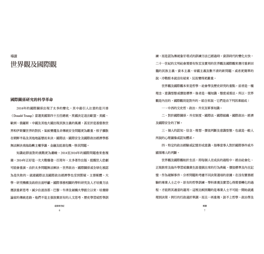 人文及社會科學一直相當專業,稱之菁英型研究並不為過,但研究者一定是關心社會、國家及整個世界。我們很容易可以看出中西之間的基本學術推力的不同,中國政治哲學講求應用性,比較不重視基本的思維,以至於本體論及認識論、邏輯或其他相關學科被忽略,現在再重新回顧有其必要。此外,本書也將現代及後現代化作了介紹,這是關係到社會科學及人類發展,特別是整個中國的歷史脈絡相關的問題,更是國際關係的最根本問題。