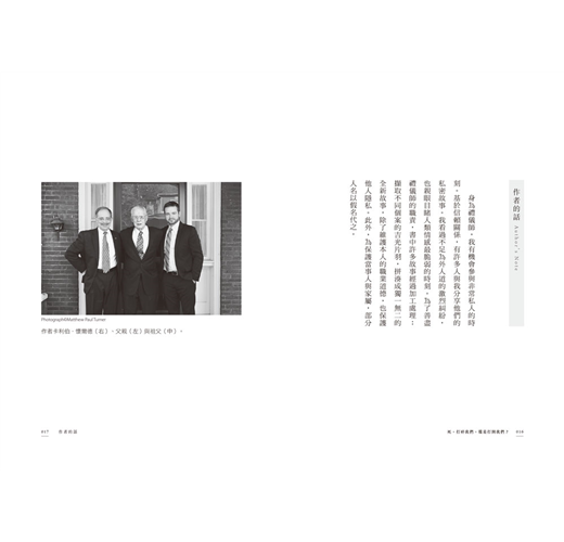 「在父親家族,我是第六代禮儀師;在母親家族,我算是第五代。我應可自稱為血統純正的禮儀師 ,身上流著合計九代的殯葬業血液。就我所知,像我這樣的人,只有我一個。」